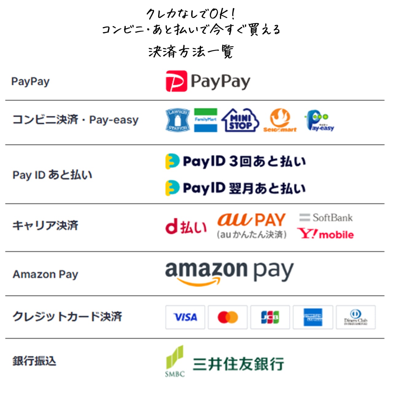 PayPay、コンビニ決済、クレジットカード、Amazon Pay、Pay IDあと払い、キャリア決済、銀行振込